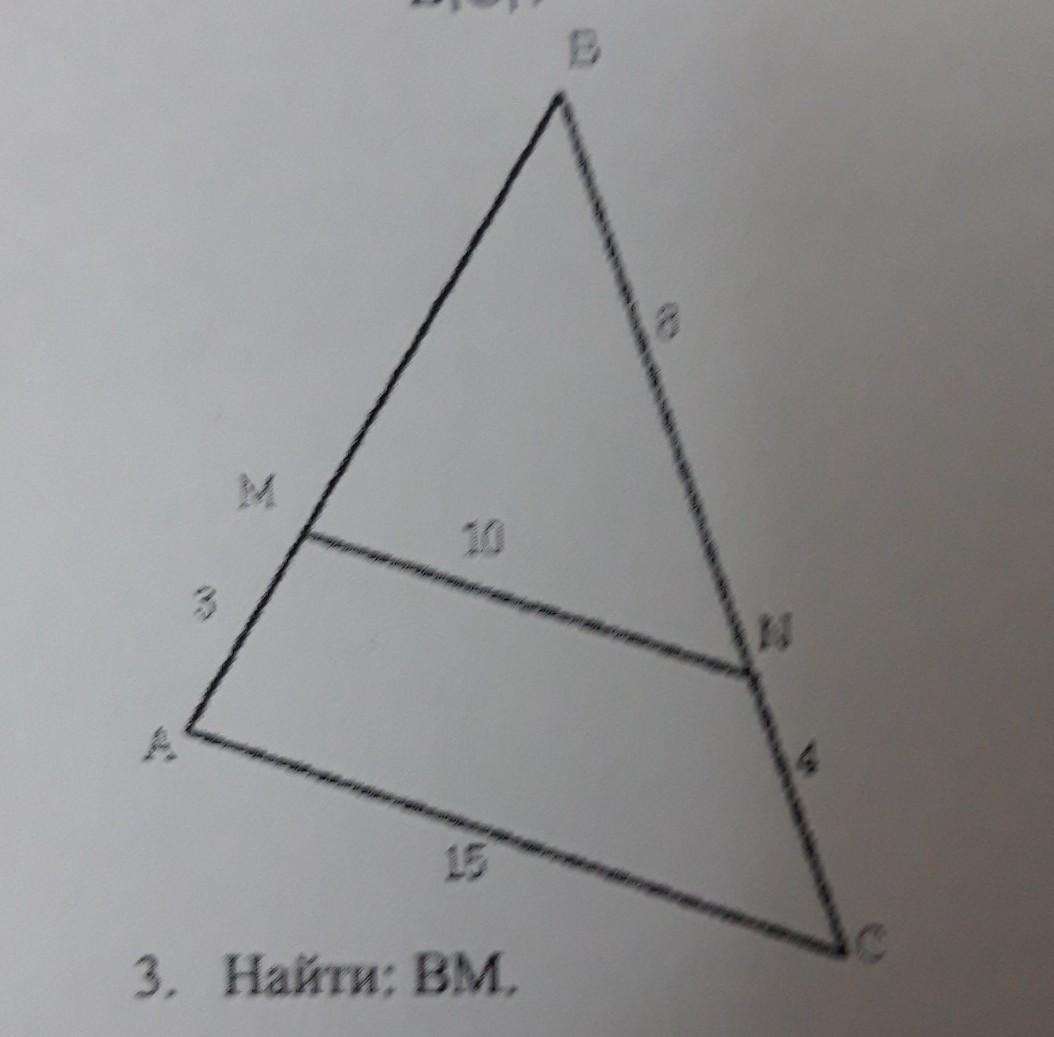 Пошаговое объяснение: АС/MN = BC/BN = АВ/ВМ = 3/2. Пусть ВМ - х, тогда АВ = 3+х, (3+х) /х = 3/2. х = 6