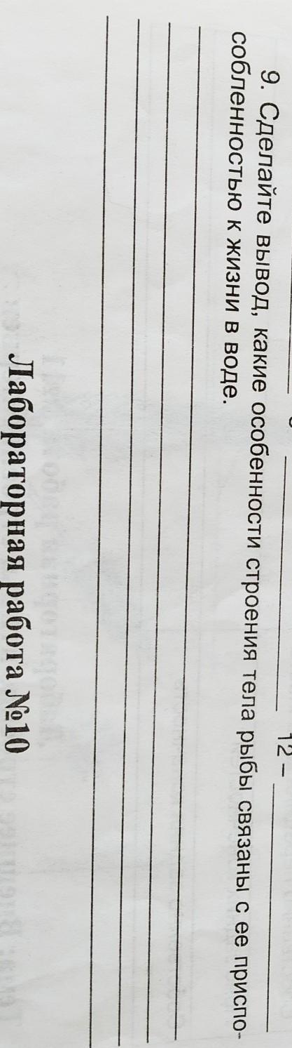 Ответ: наличие жабр, плоской роговицы глаза, отсутствие век, обтекаемая форма тела, слизь, плавники, боковая линия.