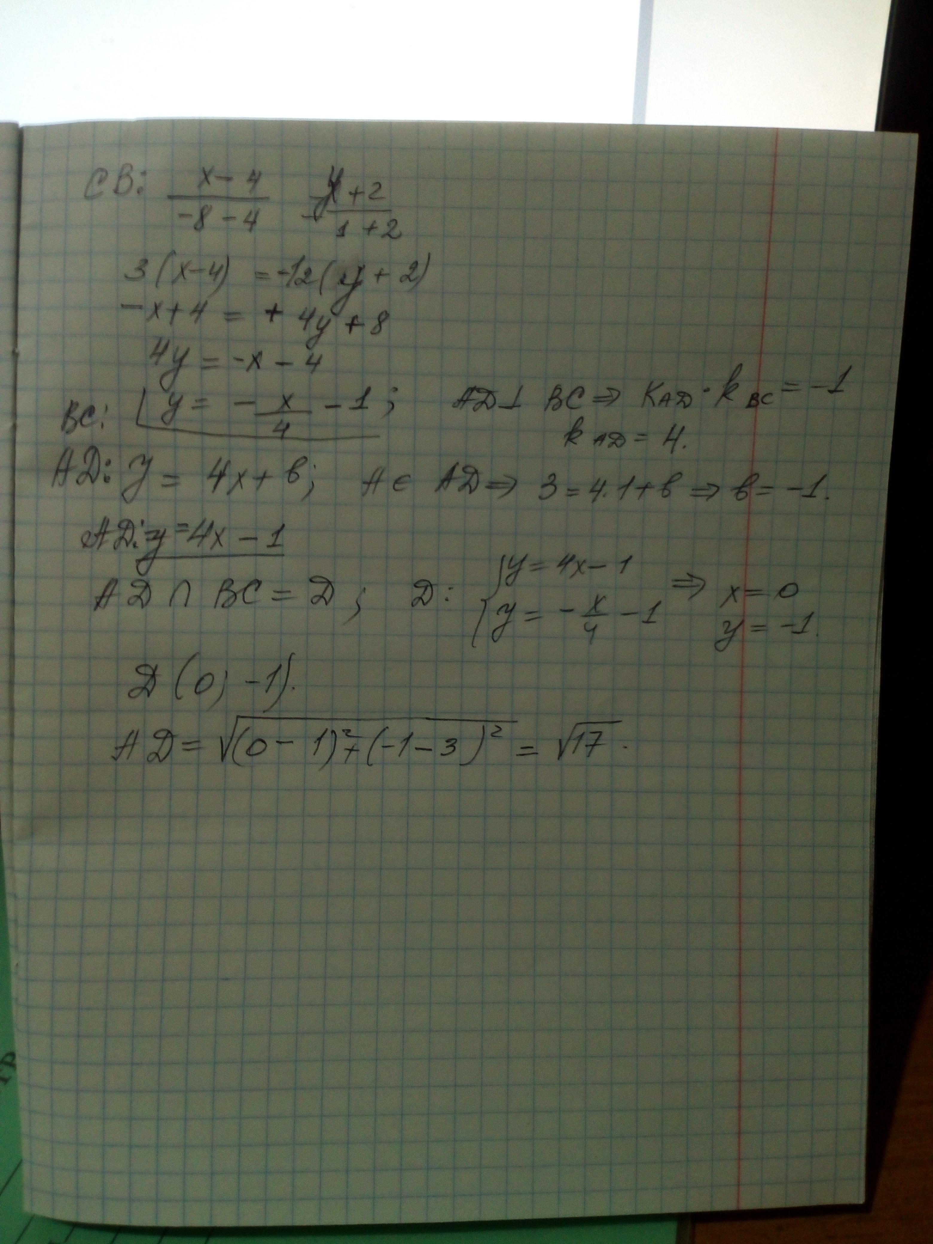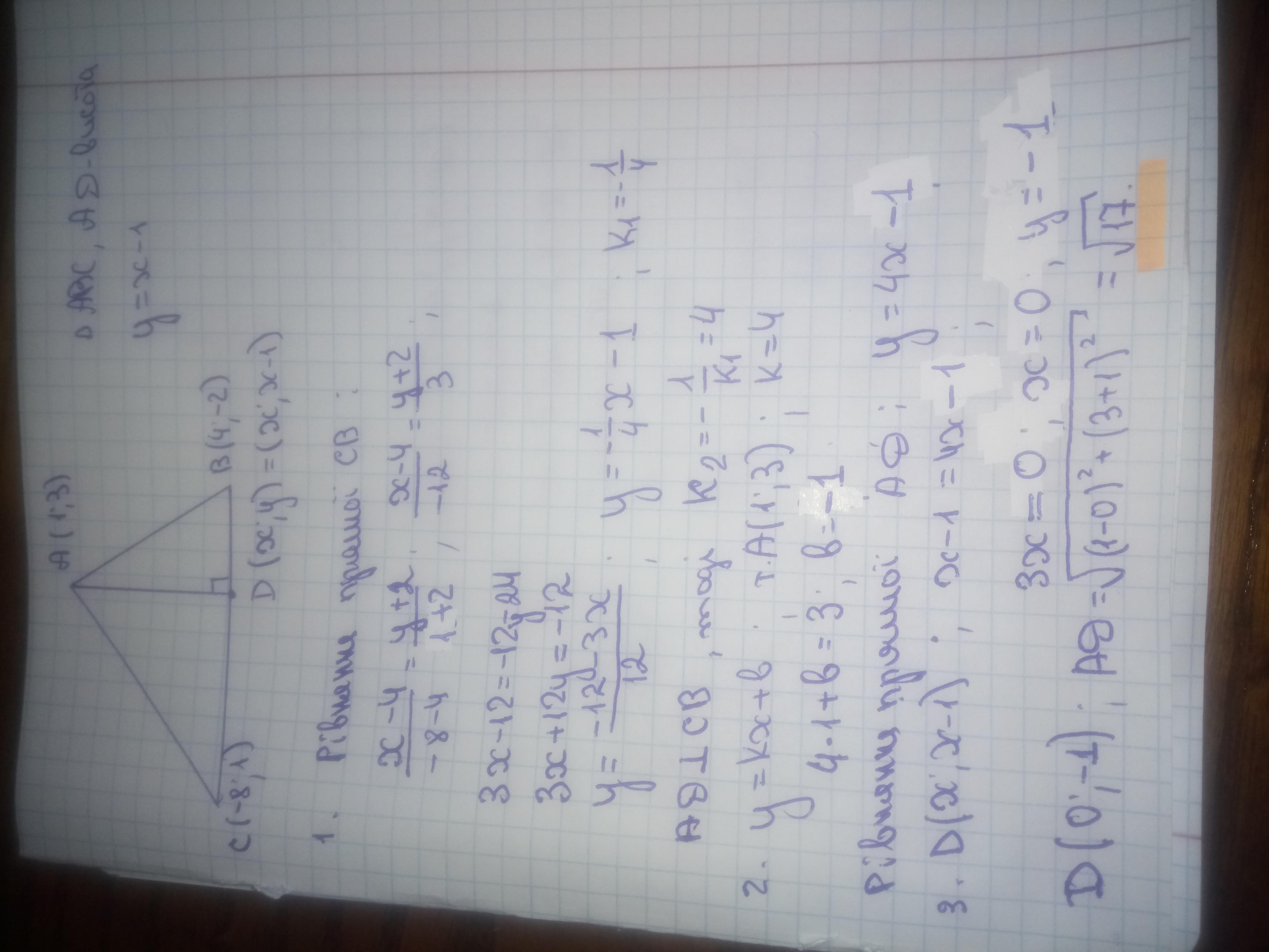 знайдіть довжину висоти АD трикутника АВС, якшо відомо, що ордината точки D на 1 одиничний відрізок менша від її абсциси