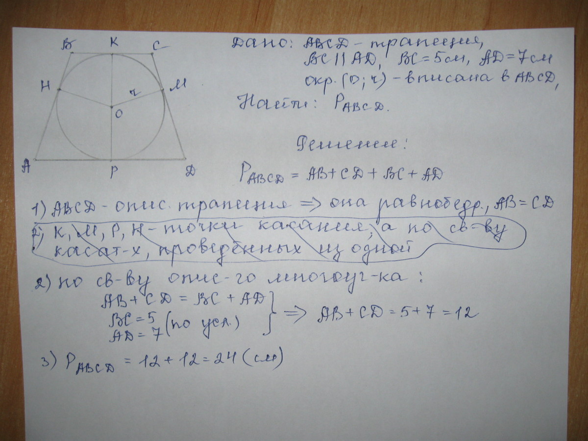 Pabcd = АВ + CD + BC + AD = 2(BC + AD) = 2 · (5 + 7) = 2 · 12 = 24 см