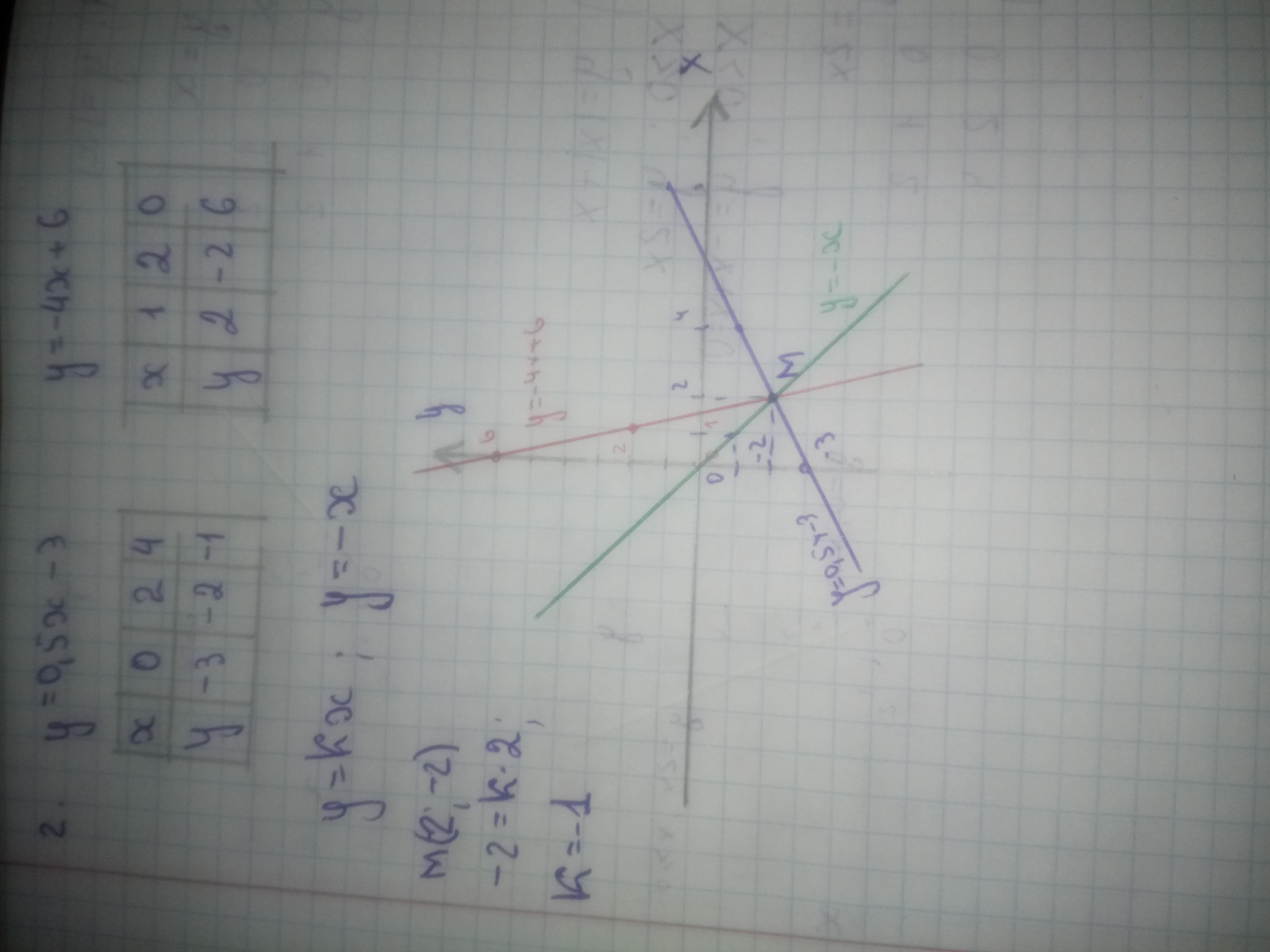 2. Графіки функції y = 0,5 x – 3, y = -4x + 6 і y = kx перетинаються в одній точці. Знайдіть значення k. Побудуйте в одній системі координат графіки цих функції.