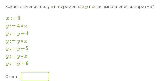 Далее переменной у присваивается значение (4*х). Мы уже знаем, что х=6 (из предыдущей строчки). Тогда 4*х=4*6=24. Это значение присваивается у. Теперь у=24.