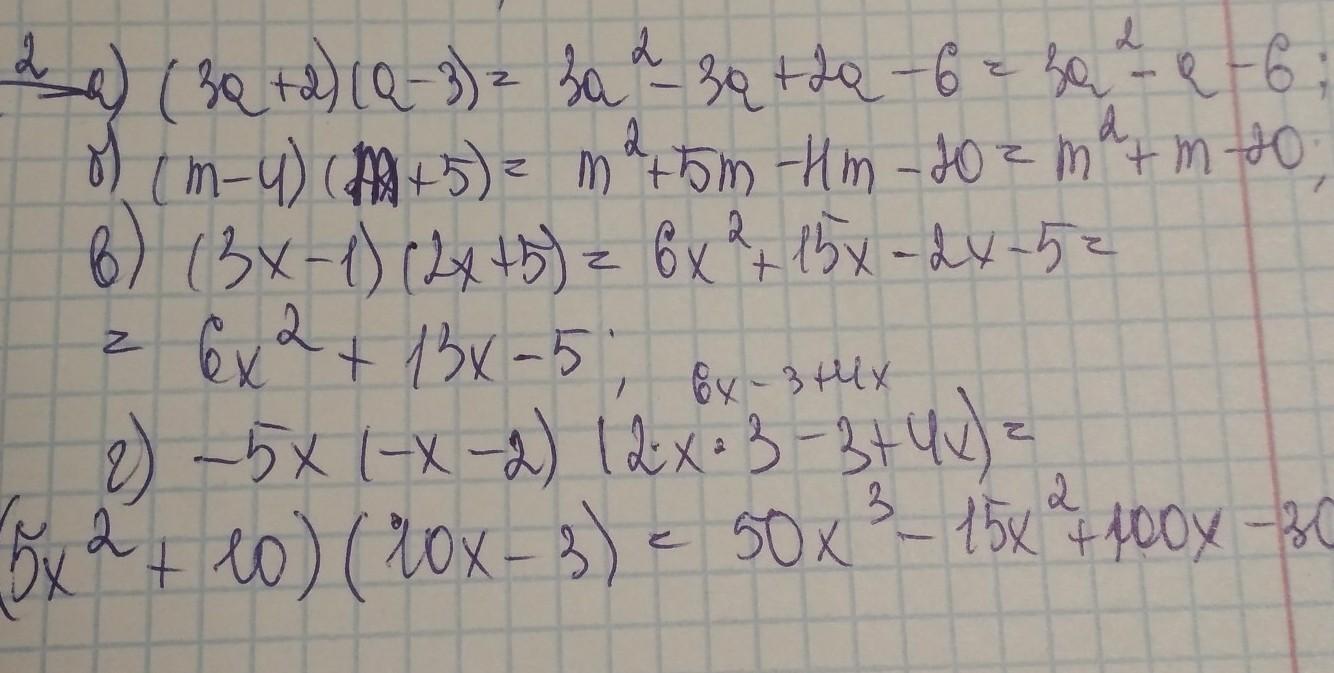 г) – 5х (–х – 2) (2х³ – 3 + 4 х) = (5x² + 10x)(2x³-3+4x) = 10x⁵ - 15x² + 20x³ +20x³ - 30x + 40x² = 10x⁵ + 40x³ + 25x² - 30x