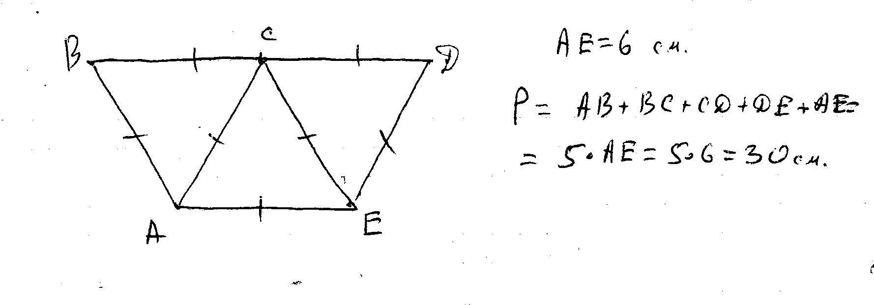 Четырехугольник составлен из трех равносторонних треугольников со стороной 6 см. Найти периметр четырехугольника.