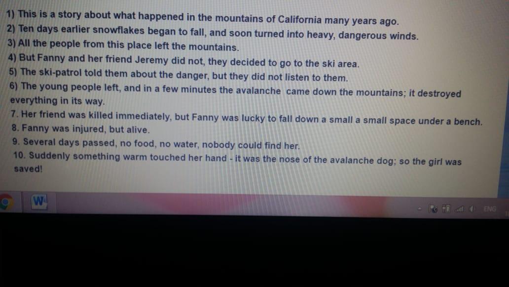 The young people left, and in a few minutes the avalanche came down the mountains; it destroyed everything in its way. Her friend was killed immediately, but Fanny was lucky to fall down a small a small space under a bench. Fanny was injured, but alive. Several days passed, no food, no water, nobody could find her. Suddenly something warm touched her hand - it was the nose of the avalanche dog; so the girl was saved!