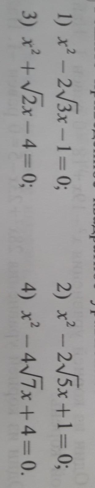 1); ; x^2-2sqrt3x-1=0\\D=4cdot 3+4=16; ,; ; x_1=frac{2sqrt3-4}{2}=sqrt3-2; ; ,; ; x_2=sqrt3+2\\\2); ; x^2-2sqrt5+1=0\\D/4=(frac{b}{2})^2-ac; ,; ; x_{1,2}=frac{-frac{b}{2}pm sqrt{D/4}}{a}\\D/4=5-1=4; ,; ; x_1=sqrt5-2; ,; ; x_2=sqrt5+2\\\3); ; x^2+sqrt2, x-4=0\\D=(sqrt2)^2-4cdot 1cdot (-4)=2+16=18; ,; ; ; sqrt{18}=3sqrt2\\x_1=frac{-sqrt2-3sqrt2}{2}=frac{-4sqrt2}{2}=-2sqrt2; ,; ; x_2=frac{-sqrt2+3sqrt2}{2}=frac{2sqrt2}{2}=sqrt2