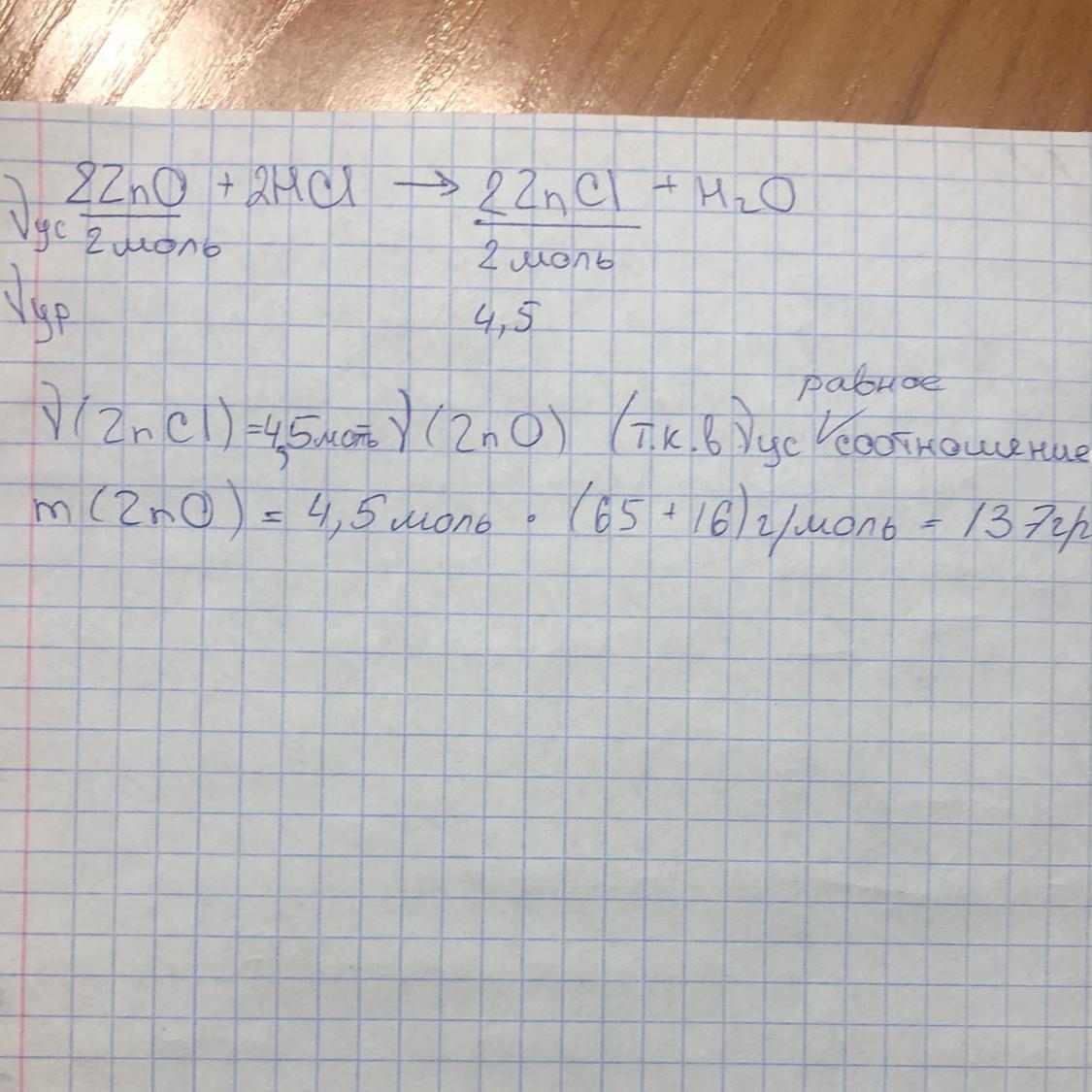 В результате взаимодействия оксида цинка с соляной кислотой HCl образовалось 4.5 моля хлорида цинка. Найдите массу оксида цинка, вступившего в реакцию. СРОЧНО!