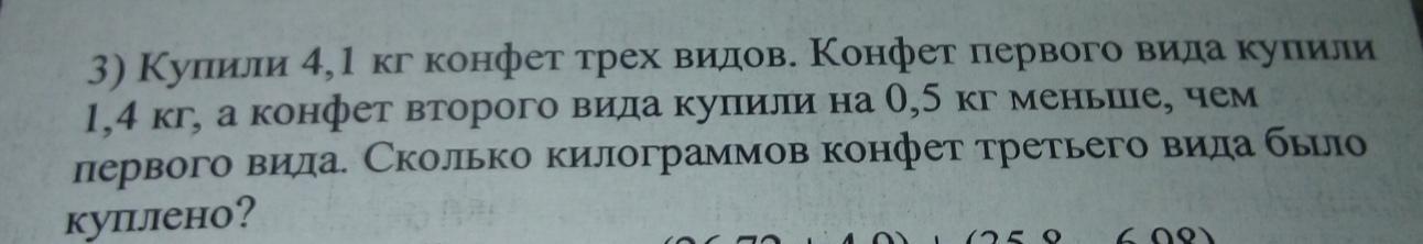 2) 4,1 - (1,4+0,9)=4,1 - 2,3= 1,8 (кг) конфет третьего вида