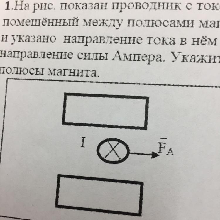 На рисунке показан проводник с током, помещённый между полюсами магнита тока в нем и направления силы Ампера . Укажите полюса магнита срочноооо пожалуйстаааа