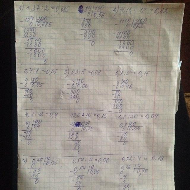 Решите столбиком 1) 1,37 : 2 8,4 : 15;11,16 : 18;0,4 : 8; 3)0,3 : 5;0,8: 5;4,8: 12;13,6 : 16;0,8: 20;4) 0,35 : 7;0,54 : 9;0,72 : 4.