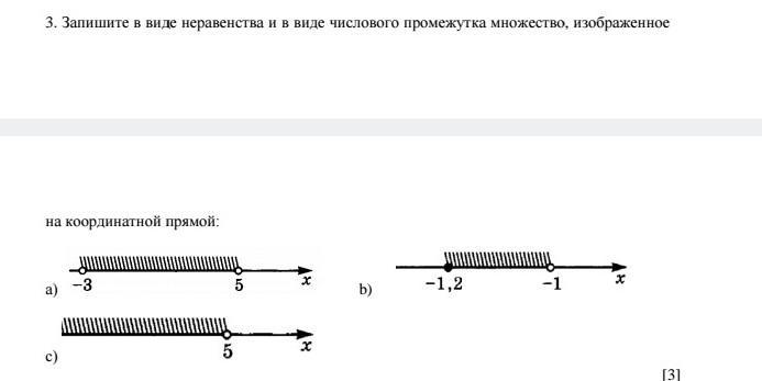 displaystyle tt a) : xin(-3; : 5)\displaystyle tt b) : xin[-1,2; : -1)\displaystyle tt c) : xin(-infty; : 5)