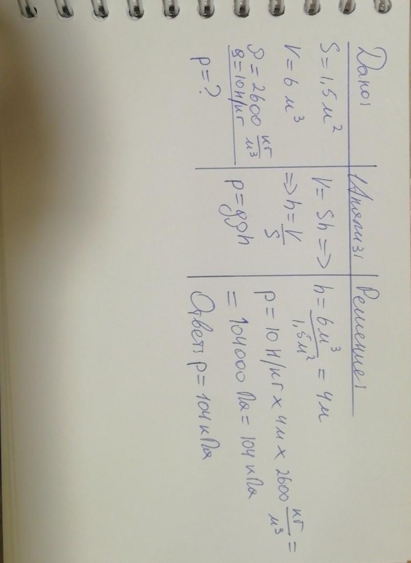 найдите давление, если площадь равна 1,5метров в квадате ,обьем равен 6 метров в кубе , плотность равна 2600 колограмм/метр в кубе