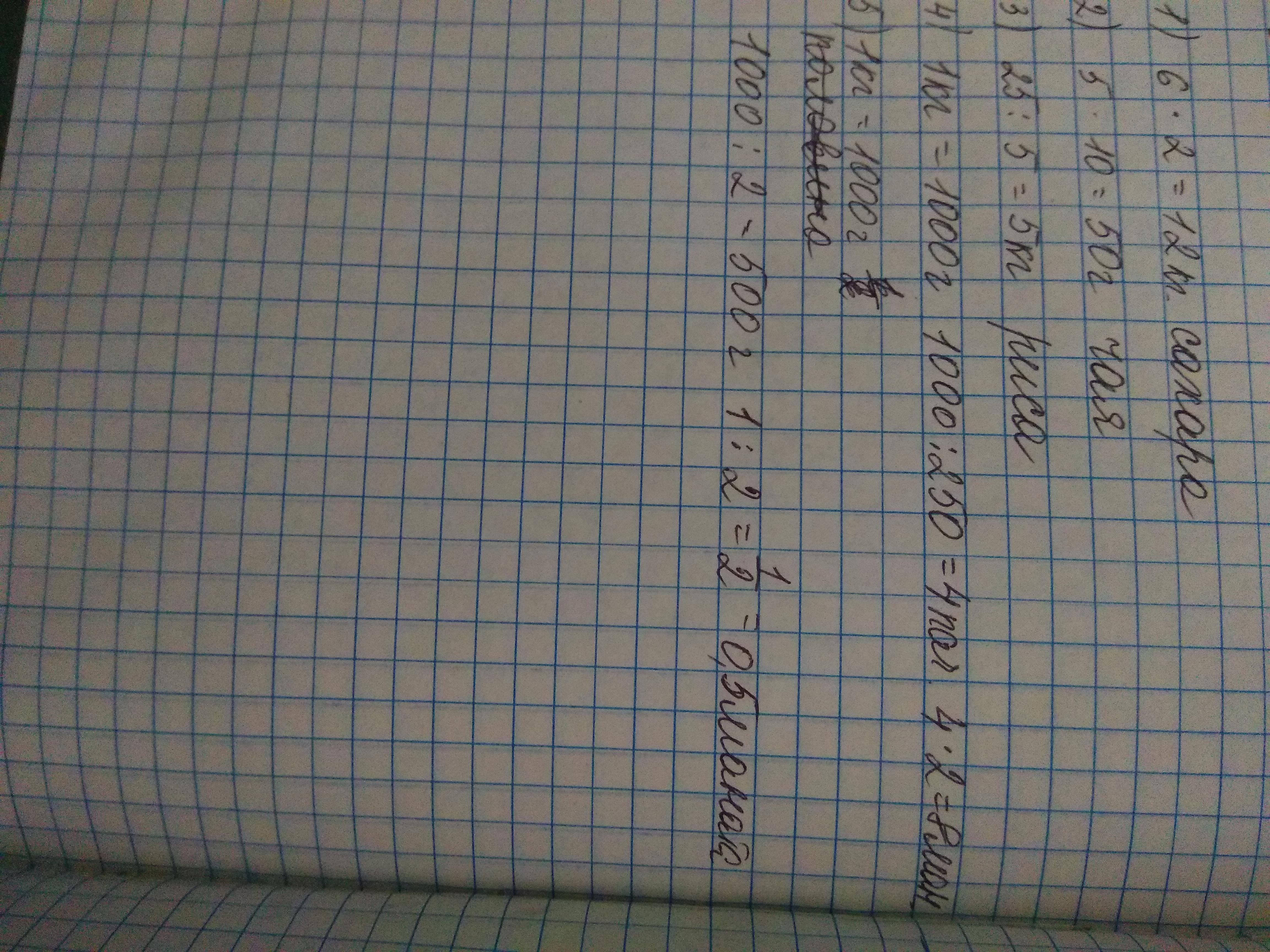Пошаговое объяснение: 1. 6•2=12(кг. сахара). 2. 10•5=50(г. чая).3. 25÷5=5(кг. 1мешок). 4. 1000÷250•2=8(манатов).5. 1÷(1000÷500)=1/2 или пол маната