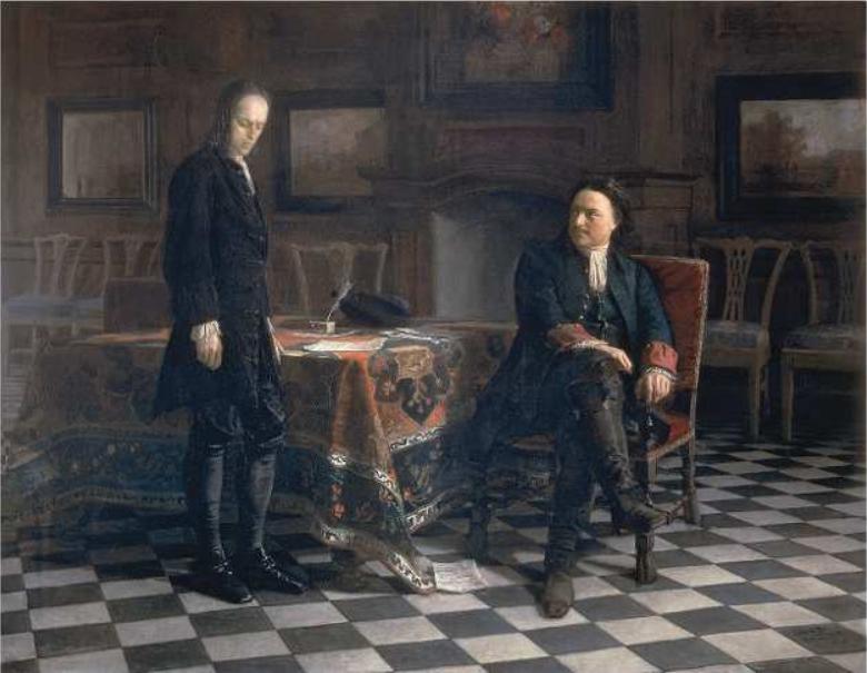 А) Перед вами картина русского художника Николая Ге, на которой изображён император Пётр I и его сын Алексей. Как вы думаете, что свидетельствует о том, что у них конфликт? На какой стадии, по вашему мнению, находится конфликт императора и его сына? Ответ объясните.