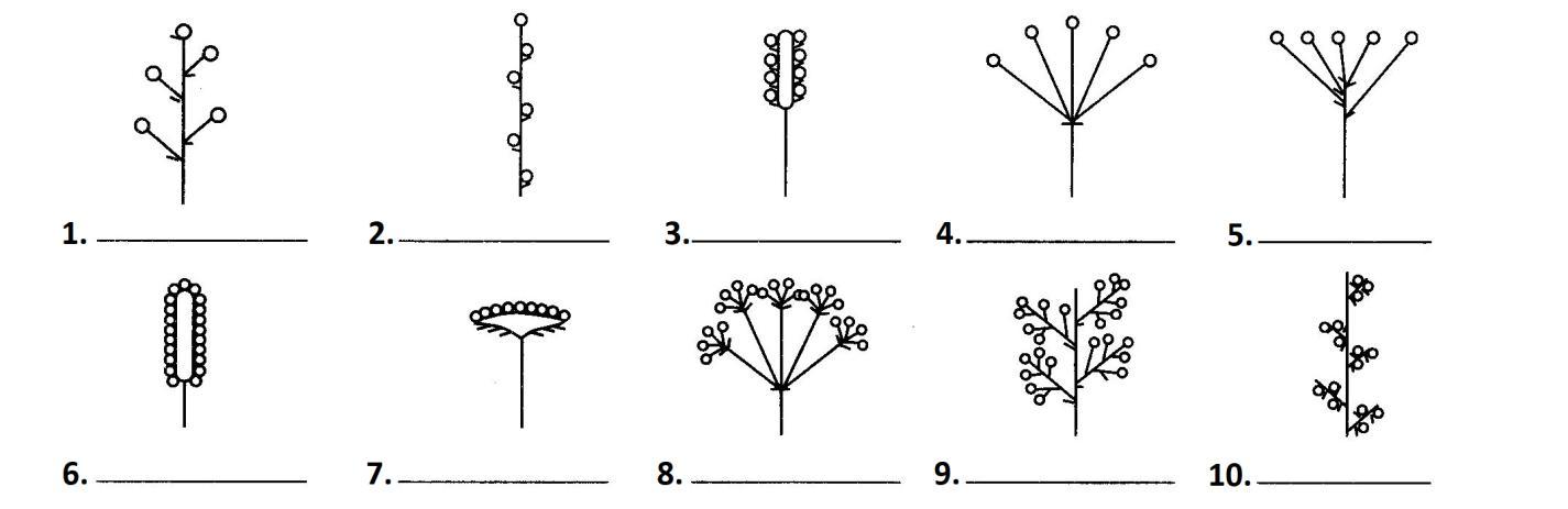 1. Китиця, 2. Колос, 3. Початок, 4. Зонтик, 5. Щиток, 6. Головка, 7. Кошик, 8. Складний зонтик, 9. Волоть, 10. Складний колос