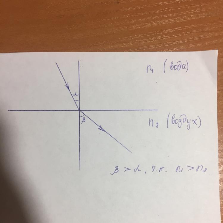 луч света переходит из воды в воздух. какой угол больше : падения или преломления. нарисовать рисунок