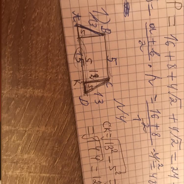 (KD получилось 5, т.к. трапеция видимо равнобедренная; BCK? - прямоугольник (на месте вопроса буква на другой высоте) => K? = BC = 5;