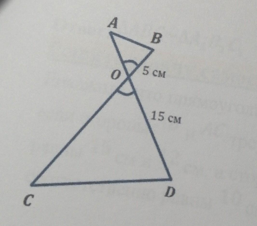 1. треугольники AOB и COD подобны по второму признаку (вертикальные углы и AO/OC=1/3=BO/OD=5/15=1/3).