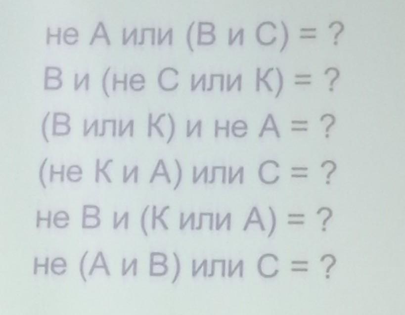 6) не (0 и 1) или 1 = не 0 или 1 = 1 или 1 = 1(истина)