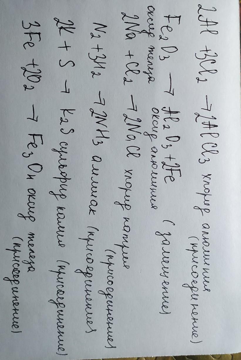 1. 2Al+3Cl=2AlCl3(хлорид алюминия) - реакция соединения