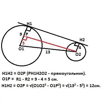 О1Р = О1Н1 - О2Н2 = R1-R2 = 9-4 = 5 cм и по теореме Пифагора
