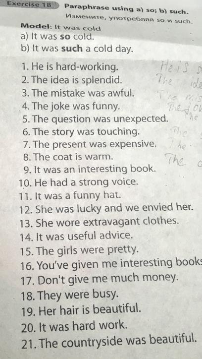 Ответ: 2.it's such a great idea. 3.the mistake was so terrible. 4.The joke was so funny. 5.The question was so unexpected. 6The story was so trogatelnaya