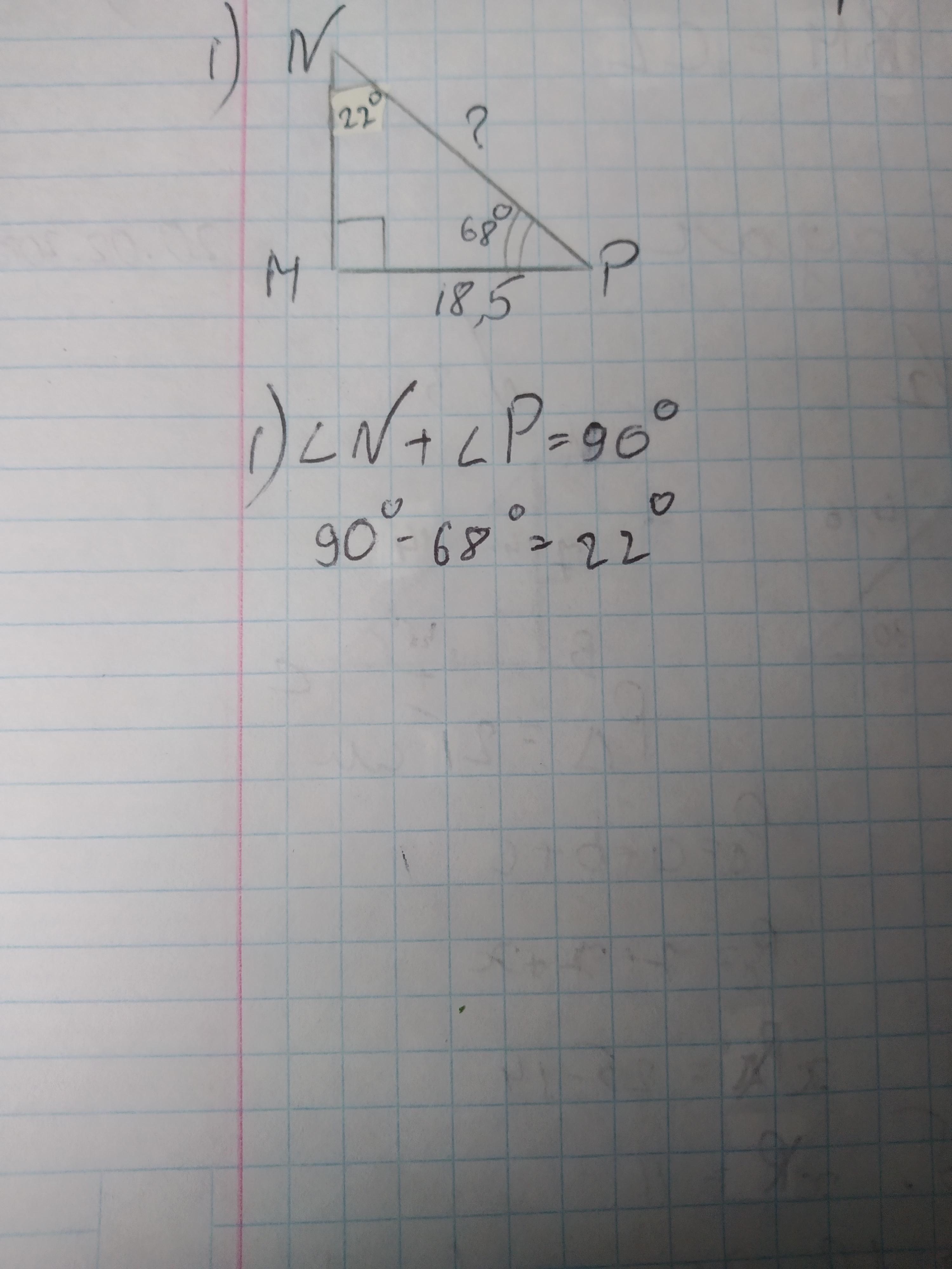 Если бы угол был 60 градусов,тогда МP лежал бы против угла в 30 градусов и равнялся половине NP.NP=2МР=2*18,5=37 см.А при угле в 68 градусов решение только через косинус.