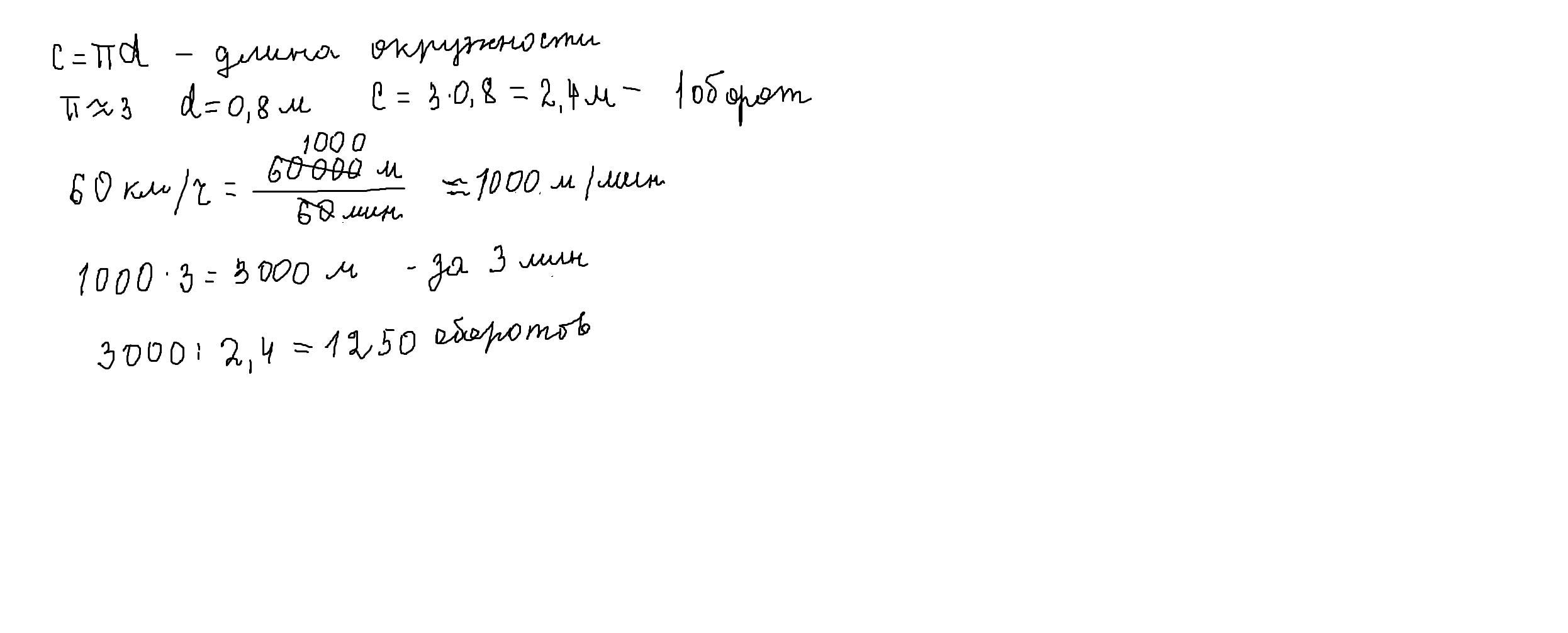 Сколько оборотов сделает за 3 минуты колесо автомобиля едущего со скоростью 60 км ч если диаметр колеса равен 0 8М число пи округлите до целых