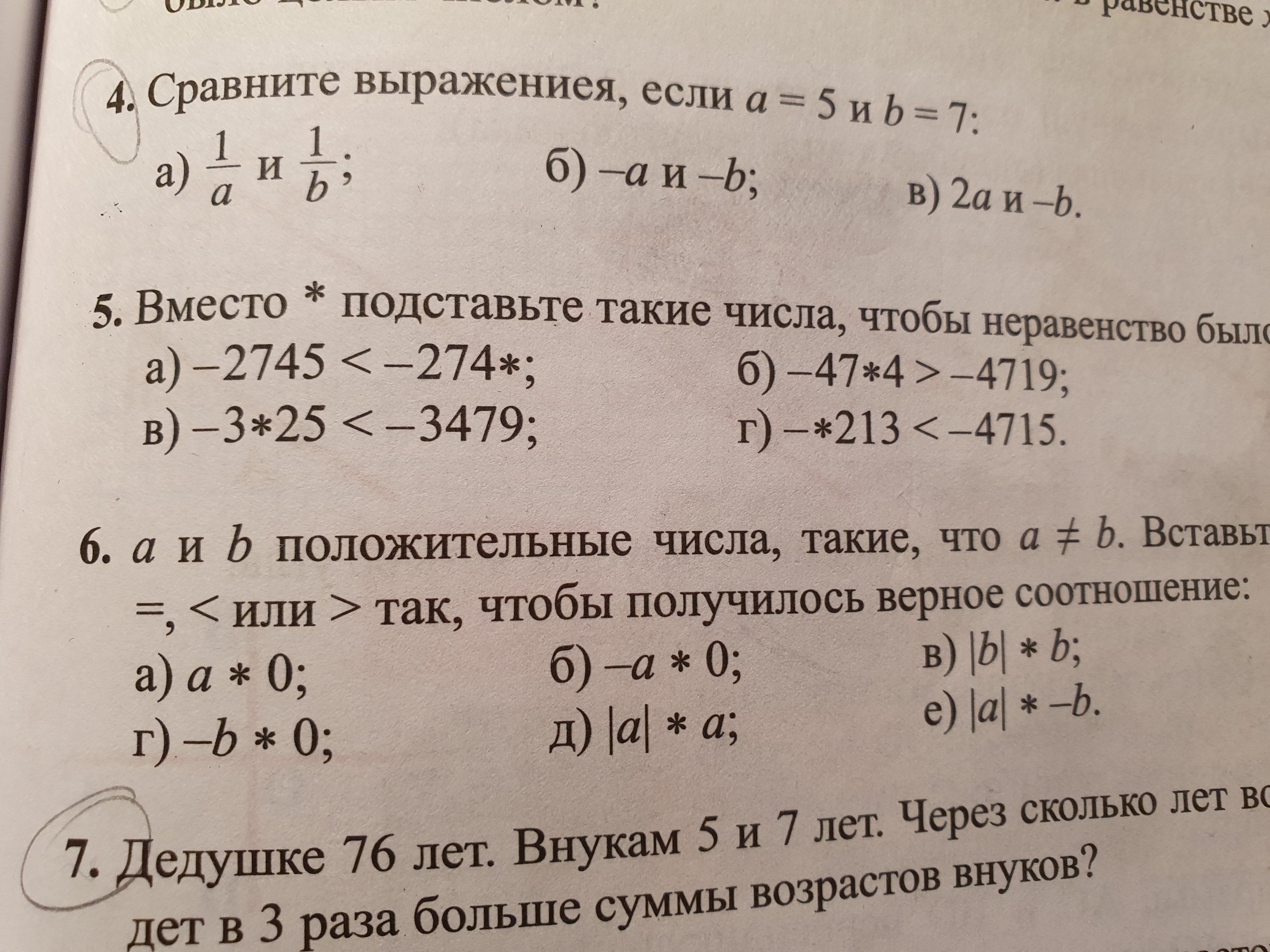 б) -5 > -7. Первое больше второго. Меньшее по модулю отрицательное больше.