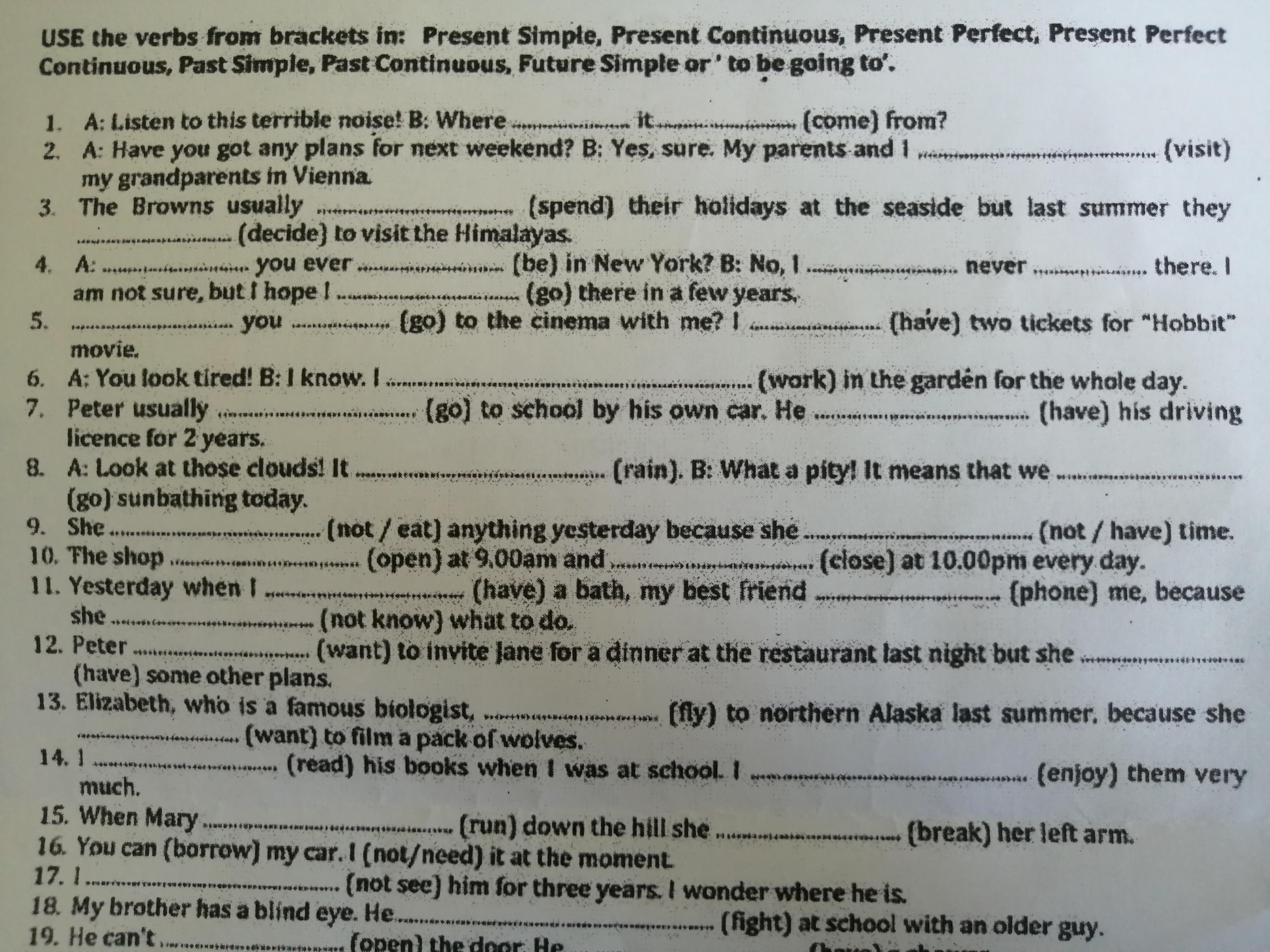 1 is it coming 2 are going to visit 3 spend- decided 4 have you ever been - have never been - will go 5 will you go - have 6 have been working 7 goes - has had 8 is going to rain - won’t go 9 didn’t eat - didn’t have 10 opens - closes 11 was having - phoned - didn’t know 12 wanted - had 13 flew-wanted 14 read - enjoyed 15 was running - broke 16 borrow- don’t need 17 haven’t seen 18 fought