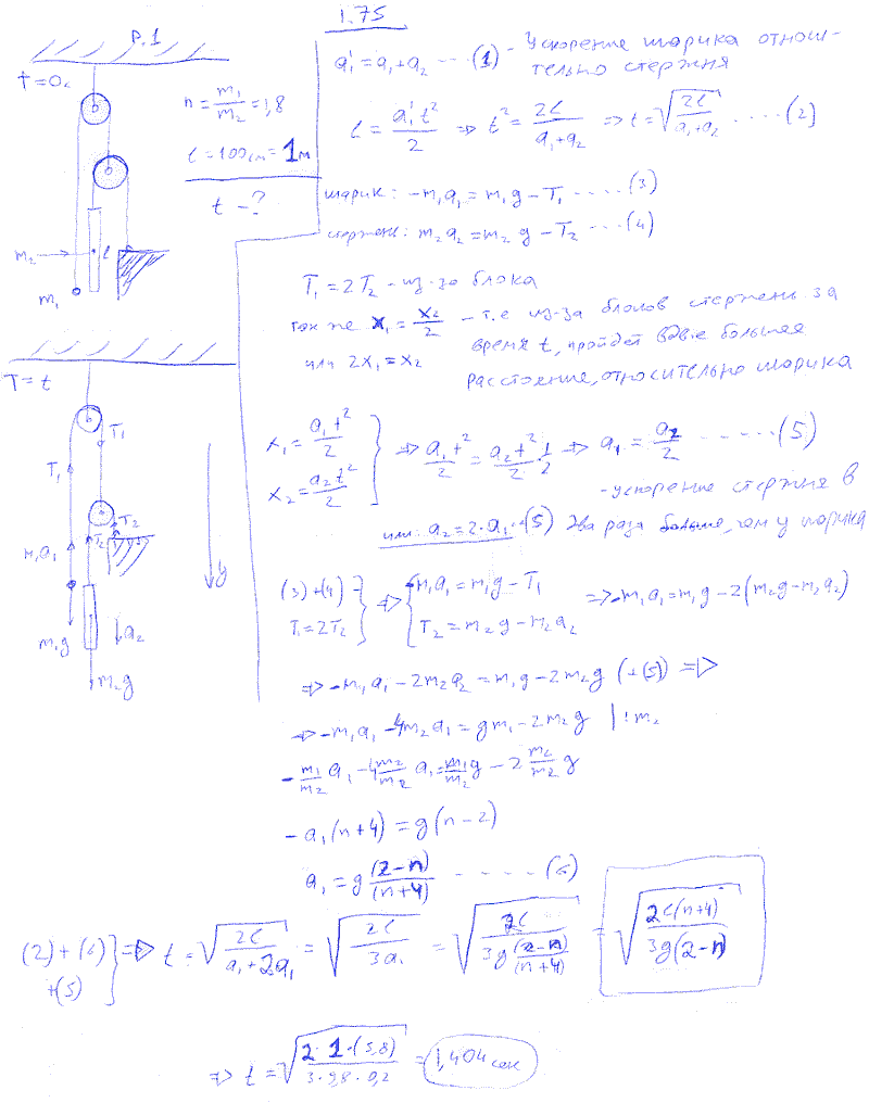 Масса шарика 1 в 1,5 раза меньше массы стержня 2,длина которого l=1м.Массы блока и нити,а также трение в оси пренебрежимо малы.Шарик установили на одном уровне с нижним концом стержня и отпустили.Найти промежуток времени,по прошествии которого шарик поравняется с верхним концом стержня.Заранее спасибо