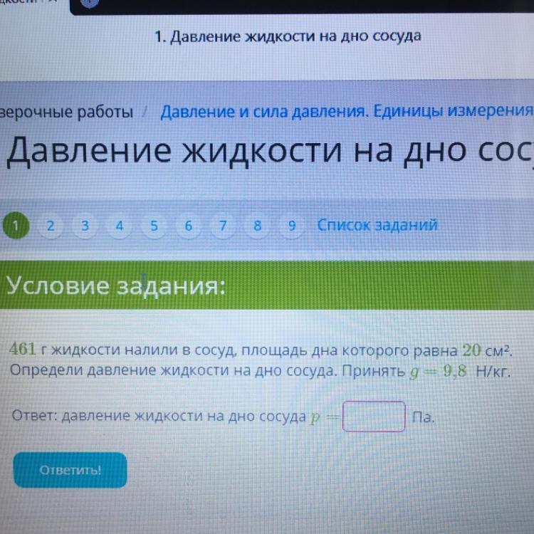 Ответ:давление жидкости на дно сосуда p= ? Па