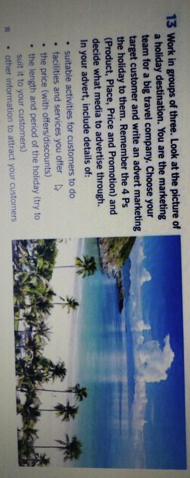 Task 1. 1.Choose a picture of a holiday destination. 2.You are the marketing manager for a big travel company. 3.Choose your target customer and write an advert marketing the holiday to them. 4. Remember the four "P" s and decide what media to advertise through. 5. In your advert, include details of: