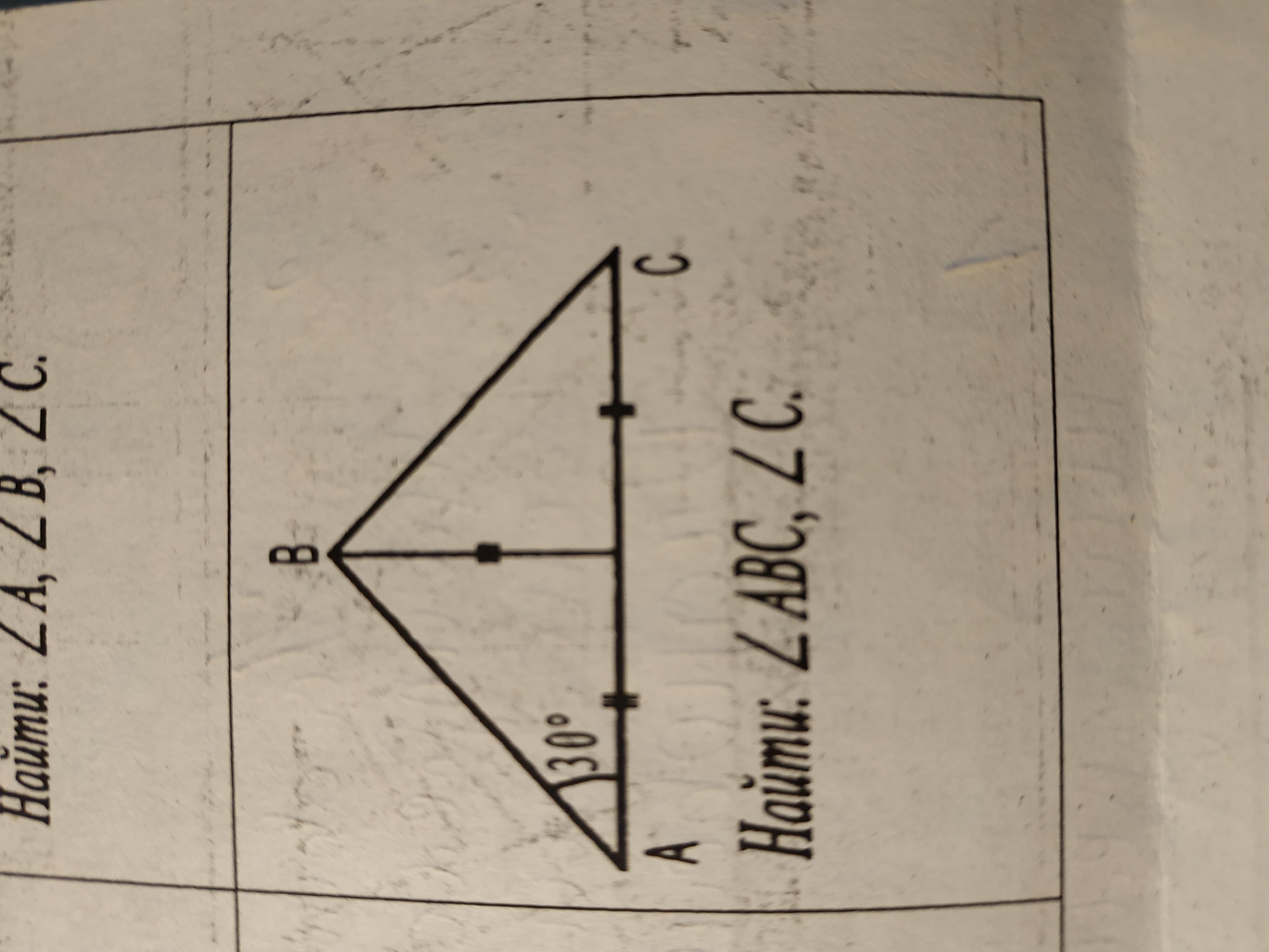 как я понял мы получили 2 прямоугольных Δ значит угол H(при высоте проведенной от основания к углу b) равен 90 градусов, следовательно угол Б равен 60 т.к. 190 - 30 - 90 = 60, теперь т.к. отрезок CH и HB треугольника CBH равны со сторонами CH и AH ABH треугольника, то тругольники CBH и ABH равны значит угол С равен углу А равен 30градусов и угол АВС равен 60*2=120(т.к.угол ABH являетя половиной угла АВС)