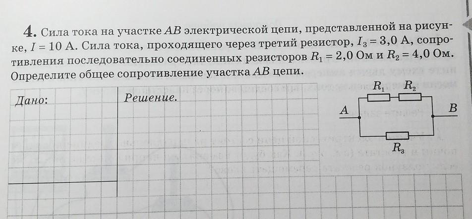 Сила тока на участке АВ электрической цепи, представленной на рисунке, I = 10 А. Сила тока, проходящего через третий резистор, I3 = 3,0 А, сопро-