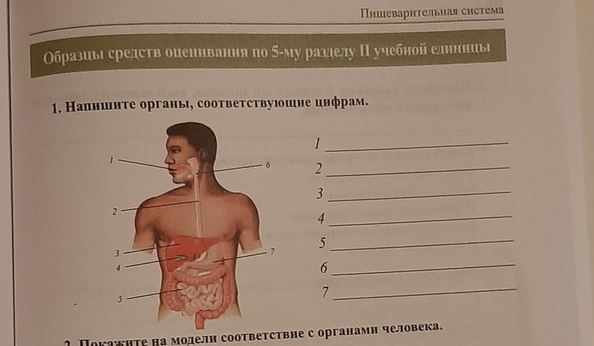 Ответ: 1- ротовая полость, 2-пищевод, 3-печень, 4-желчный пузырь, 5-тонкий кишечник, 6- глотка, 7-желудок