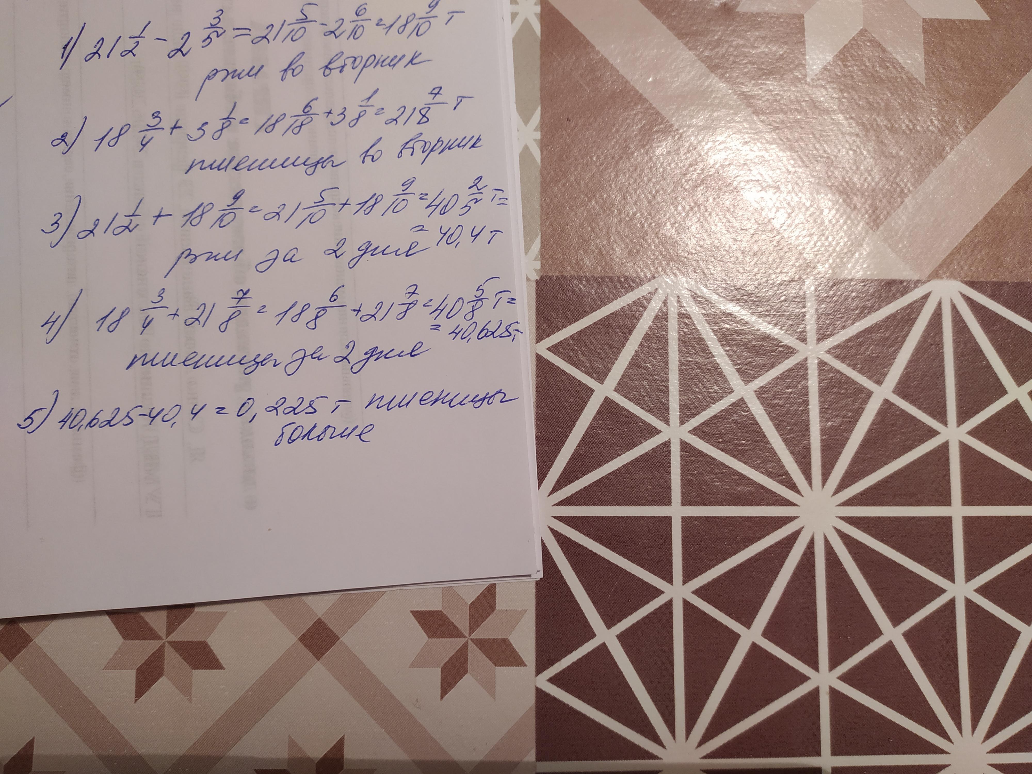 на хлебоприемный пункт крестьянин привёз в понедельник 21 1/2 тонн ржи и 18 целых 3/4 тонны пшеницы. во вторник ржи привезли на 2 3/5 тонн меньше, а пшеницы на 3 1/8 тонн больше чем в понедельник.какого зерна за 2 дня привезли больше И на сколько тонн больше????