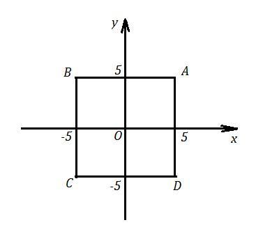 Вершина в 1 координатной четверти имеет координаты А(5,5) , во 2 коорд. четверти В(-5,5) , в 3 коорд. четверти С(-5,-5) , в 4 коорд. четверти D(5,-5) .