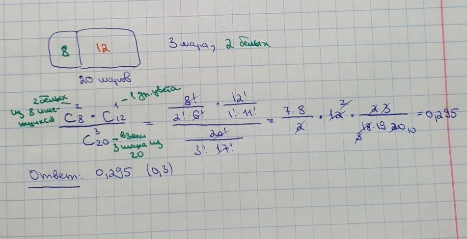 В урне 20 шаров из них 8 белых наугад берут 3 найти вероятность того, что среди них ровно две белые