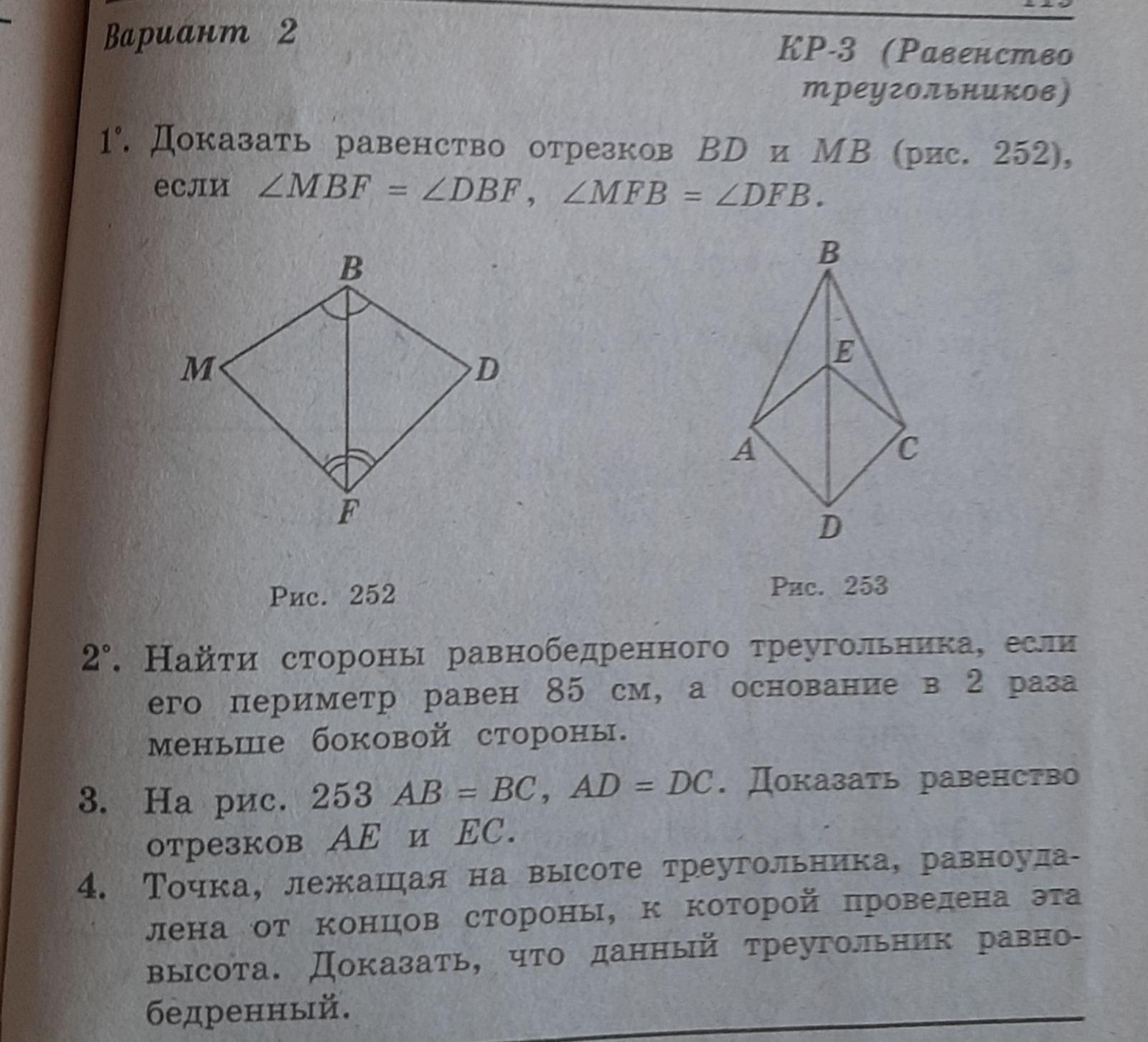 Объяснение: Рассмотрим ΔMBF и ΔBDF: BF- общая сторона,∠MBF=∠FBD (по условию), ∠MFD=∠BFD (по условию). Значит,ΔMBF=ΔBDF (по стороне и двум прилежащим к ней углам). Поэтому BD=MB.