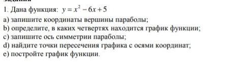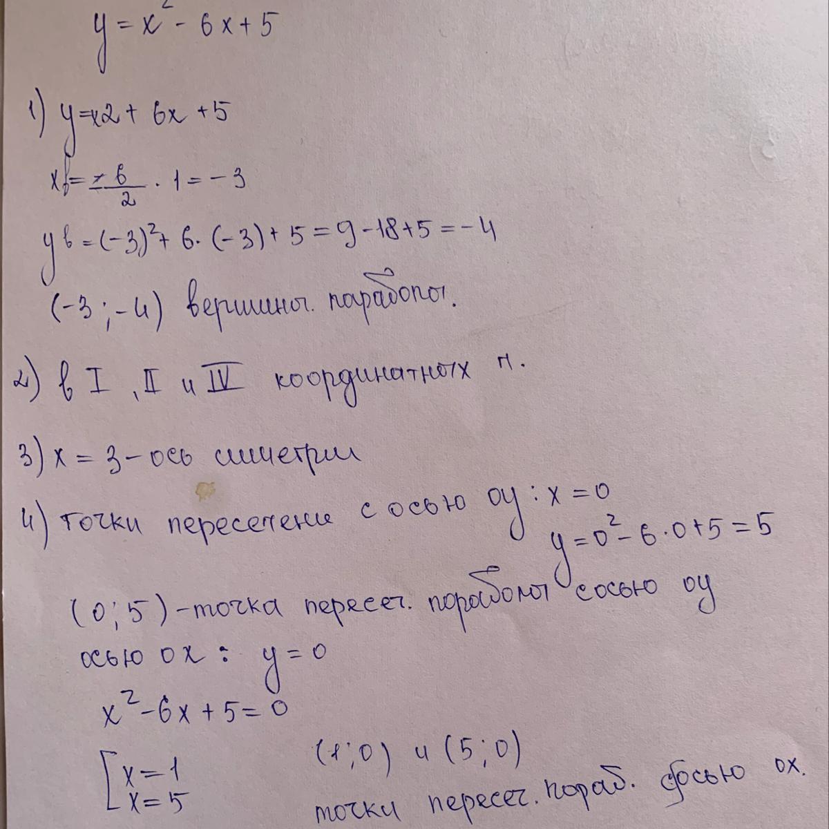 Ответ: а) B (3 ; -4) ; b) график функции лежит в первой, второй и четвёртой четвертях. ; с) ось симметрии параболы : x = 3 ; d) точки пересечения с осями координат: A₁ (1 ;0) ; A₂ (5 ;0) ; C(0;5) .