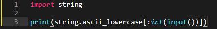 Модуль string в Python 3 содержит константу ascii_lowercase, представляющую собой строку из английских (ASCII) букв в алфавитном порядке, записанных в нижнем регистре. В нашем задании нам нужно всего лишь взять эту строку, и сделать её срез от 0 элемента до нужного нам.