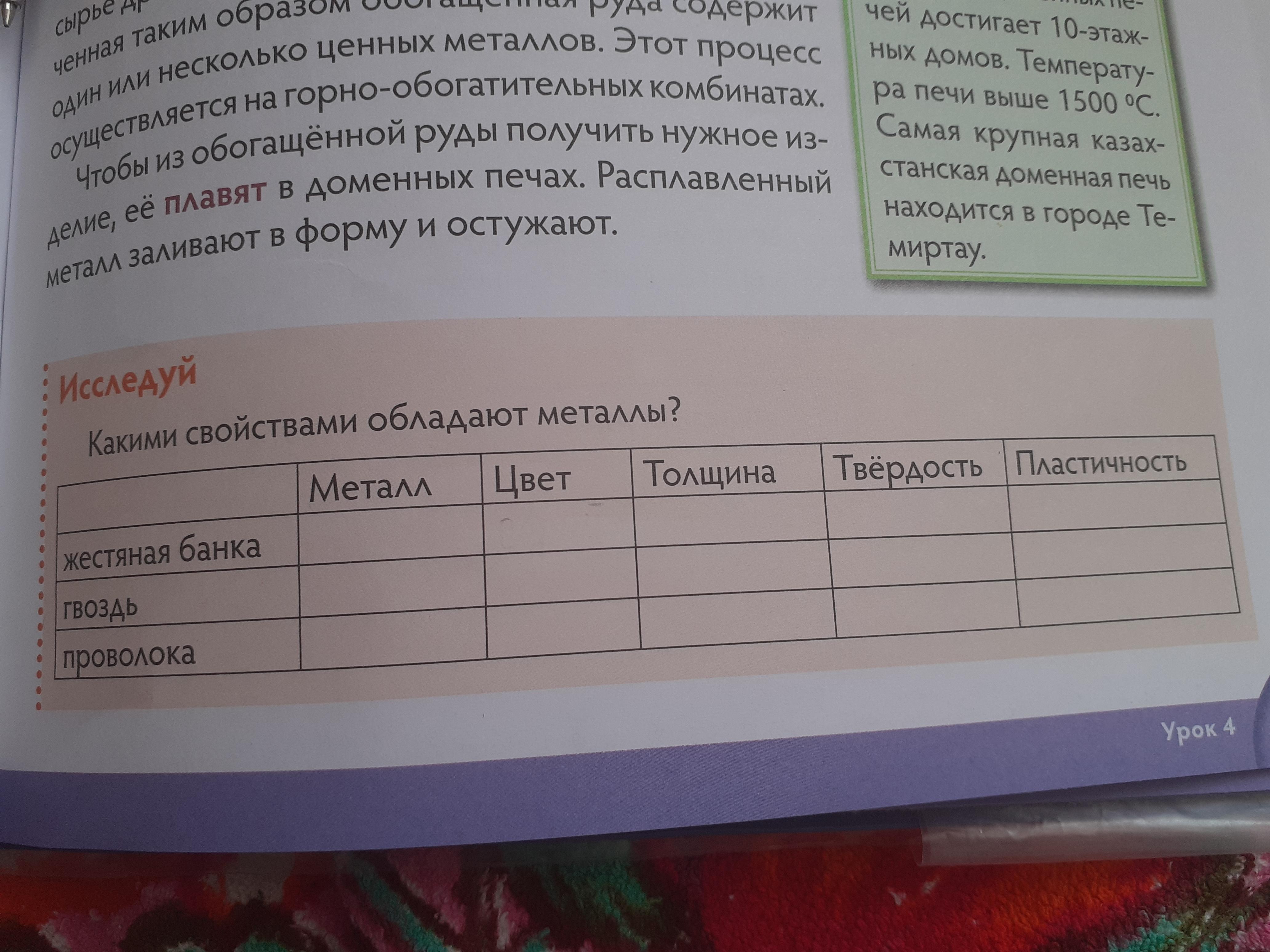жестяная банка:металл медь ,цвет серебристый,толщина тонкая,твёрдость не большая,пластичность мало пластичная