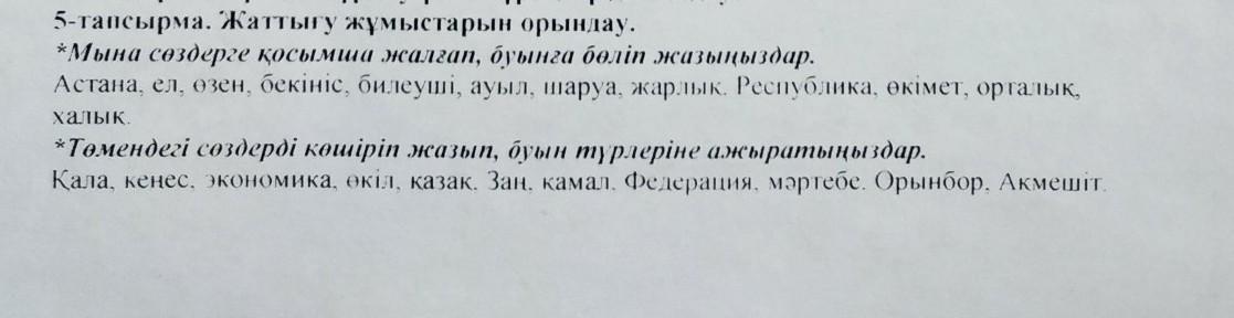 помогите пожалуйста с 5 тапсырма мына сөздерге қосымша жалғап, буынға бөліп жазыңыздар.