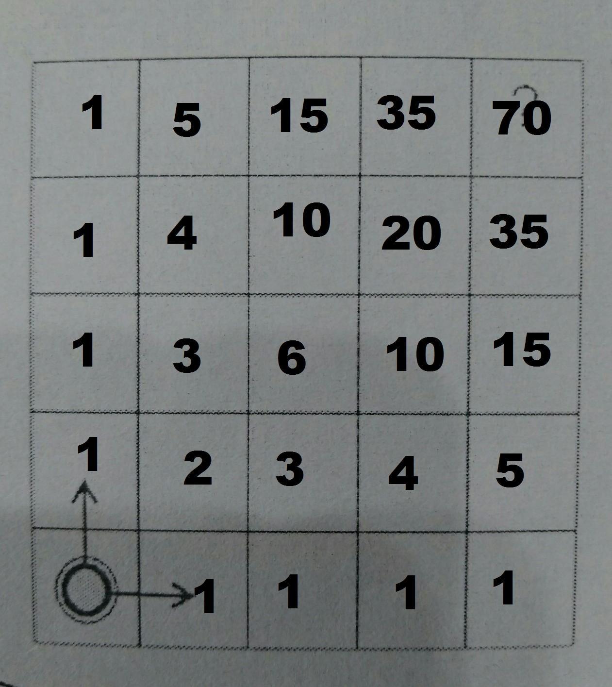 по нижней строке и па левому столбцу у нас в каждую клетку попасть один способ, потому что при любом повороте вправо (для столбца) или вверх (для строки), на эти клетки уже не вернутся