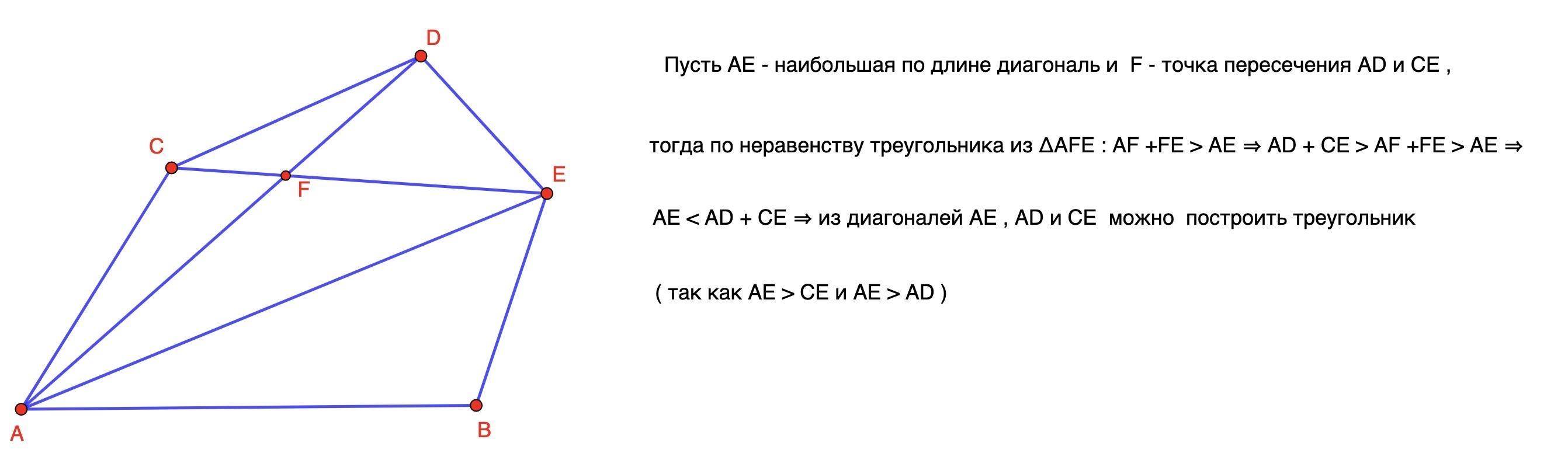 МАША НАРИСОВАЛА ВЫПУКЛЫЙ ПЯТИУГОЛЬНИК. САША ИЗМЕРИЛ ДЛИНЫ ВСЕХ ЕГО ДИАГОНАЛЕЙ. ДОКАЖИТЕ, ЧТО САША МОЖЕТ НАРИСОВАТЬ ТРЕУГОЛЬНИК, ДЛИНЫ СТОРОН КОТОРОГО РАВНЫ КАКИМ ТО ТРЁМ ИЗ ЭТИХ ПЯТИ ЧИСЕЛ