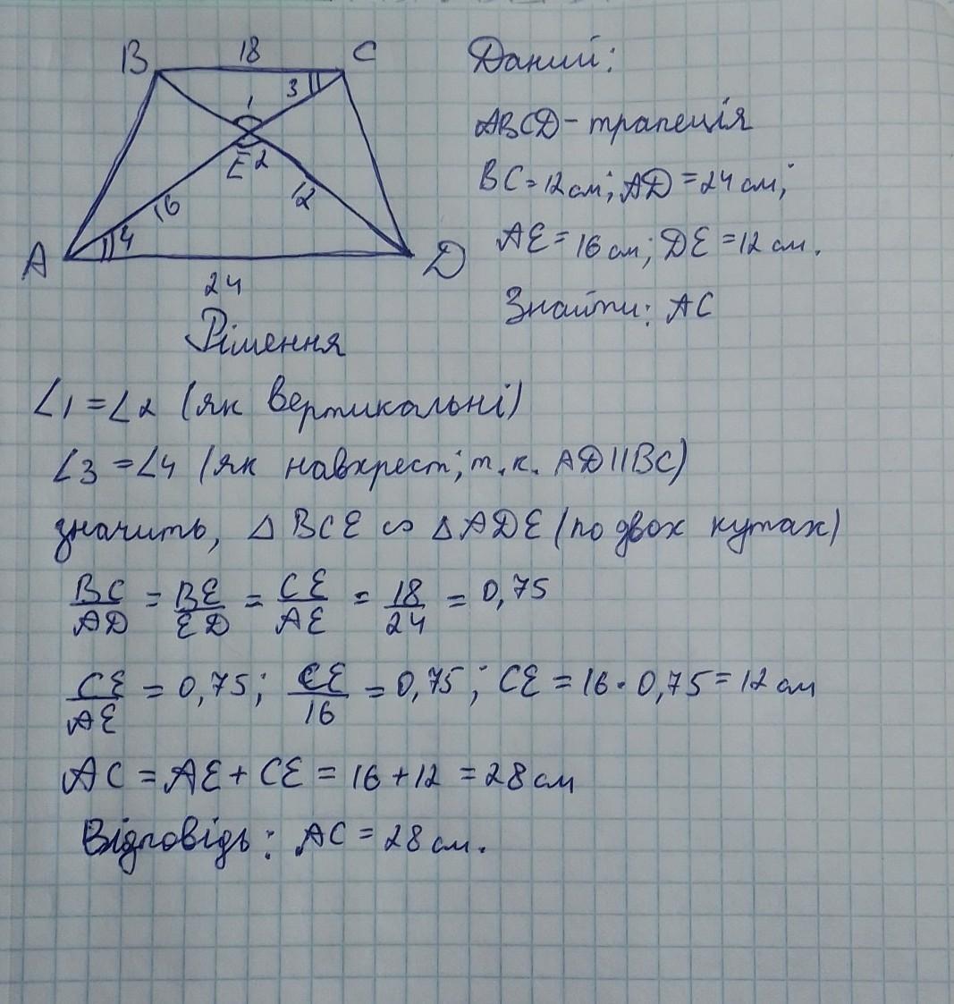 Діагоналі AC і BD трапеції ABCD, основи якої BC=18см, AD=24см, перетинаються у точці E так, що AE=16см DE=12 см. Знайти AC.
