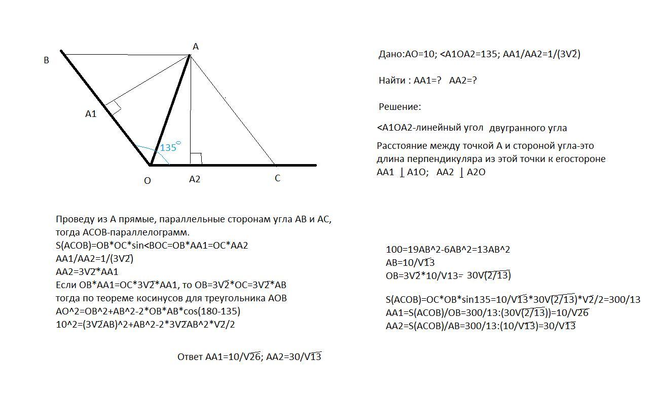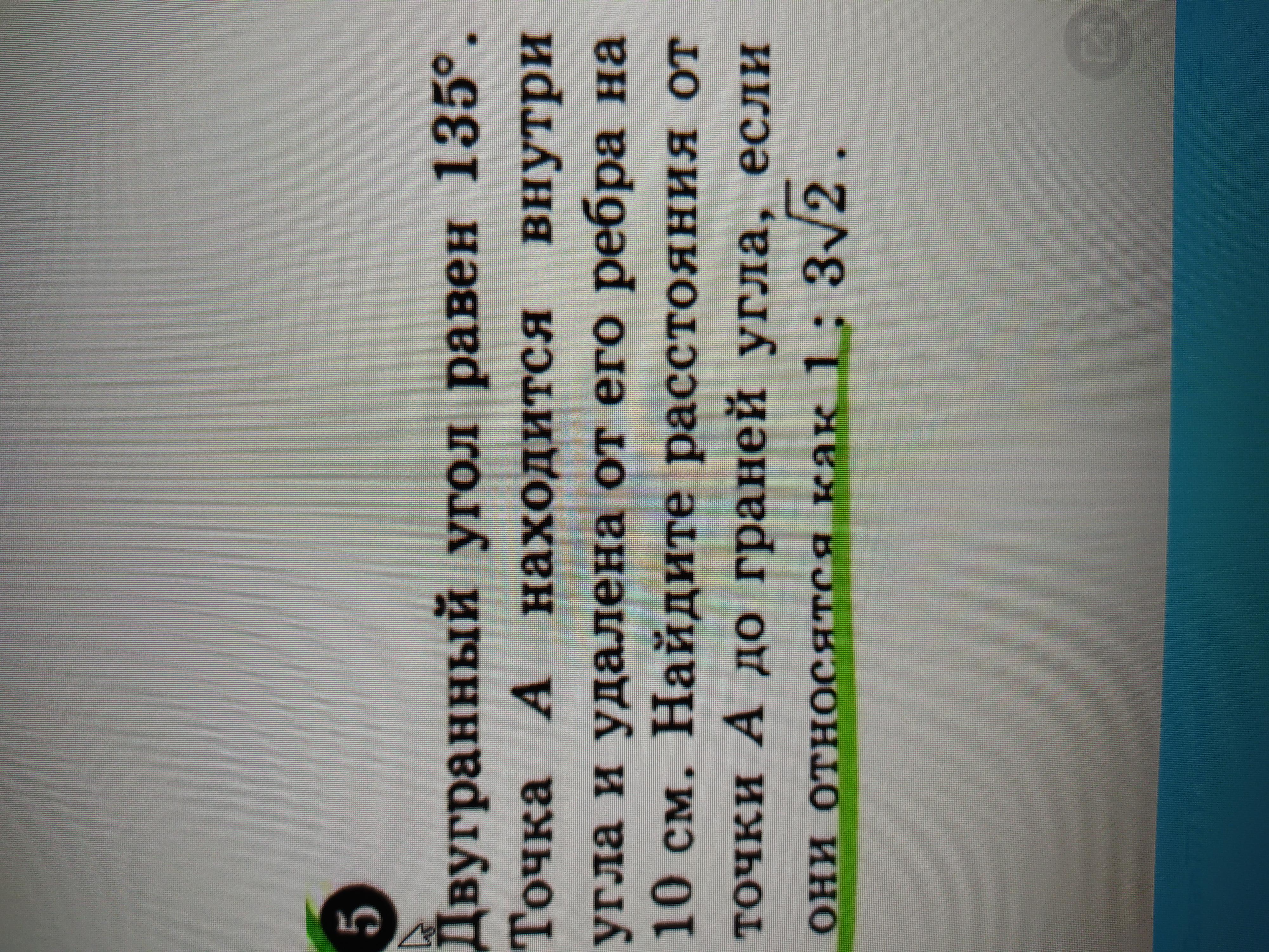 СРОЧНО 45 БАЛЛОВ Двугранный угол равен 135°. Точка А находится внутри угла и удалена от его ребра на 10 см. Найдите расстояния от точки А до граней угла, если они относятся как 1: 3 корней из 2. Нужно четкое решение с условием рисунком дано решение и ответ. заранее благодарю