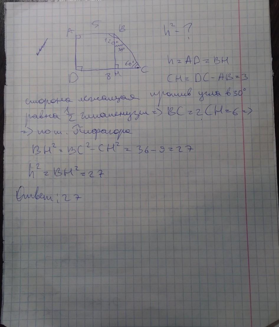 73 БАЛЛА!!!!!!!!!!!!!!!!!!!!!Найдите квадрат высоты прямоугольной трапеции, если длины её оснований равны 5 и 8, а тупой угол равен 120∘.