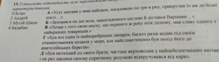 Складіть відповідність між персонажами твору Миколи Гоголя "Тарас Бульба" і його характеристиками.